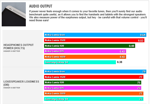 The “audio output voltage” (.54V) and the “loudness of the speakerphone” (79dB) on the Nokia Lumia Icon is the best of ANY SMARTPHONE ON THE MARKET. This includes the Samsung Galaxy S4 and all other Lumias, including the 1520.