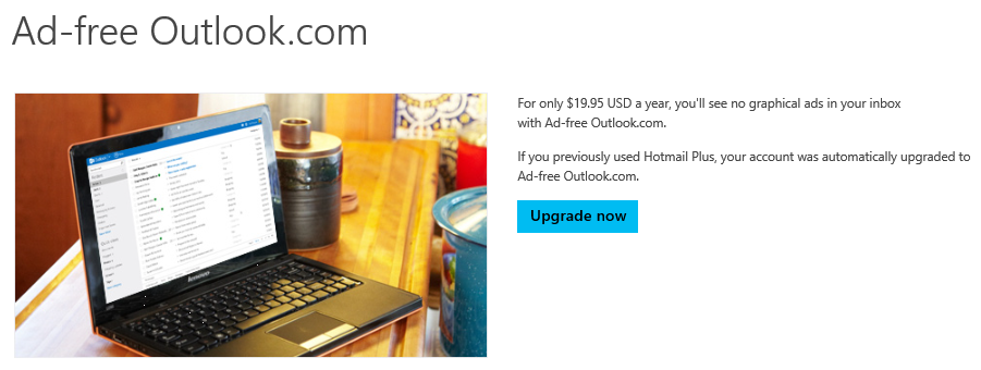 Did you ever wonder how you can pay to get rid of any presence of ads on Outlook.com? This is one of those hidden gems that’s been around forever but no one knows about. It was originally called “Windows Live Hotmail Plus” but got renamed a bit ago.