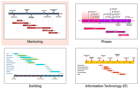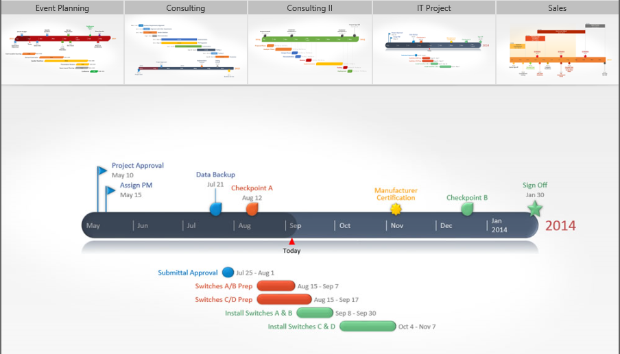The above photo is an example of the kind of timeline you can generate and insert into your PowerPoint presentation through a quick wizard. They have different templates, different chart types, different use cases, etc.