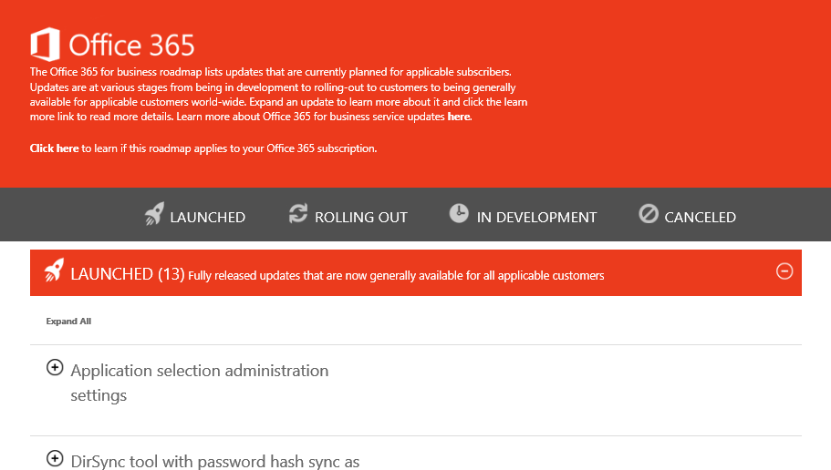 The Office 365 for business roadmap lists updates that are currently planned for applicable subscribers. Updates are at various stages from being in development to rolling-out to customers to being generally available for applicable customers world-wide. Expand an update to learn more about it and click the learn more link to read more details. Learn more about Office 365 for business service updates here.