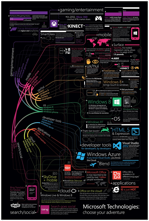 There’s an infographic posted by my colleague, Steve Clayton, on the Next@Microsoft blog that has been “used by the Microsoft recruitment team to show the wide and varied careers available at the company. Whether it’s search, cloud, social, NUI, gaming, developer tools, phones, Windows, Kinect – there is something for everyone at Microsoft.”