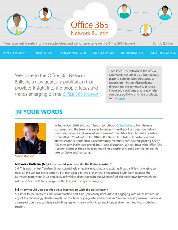 Every day, tons of valuable information grounded in real-world experience with Office products is shared on the Office 365 Network. To help you get the best of community content in an easy to read format, we’re launching the Office 365 Network Bulletin, a new quarterly publication that delivers insight into the people, ideas and trends emerging on the Office 365 Network.