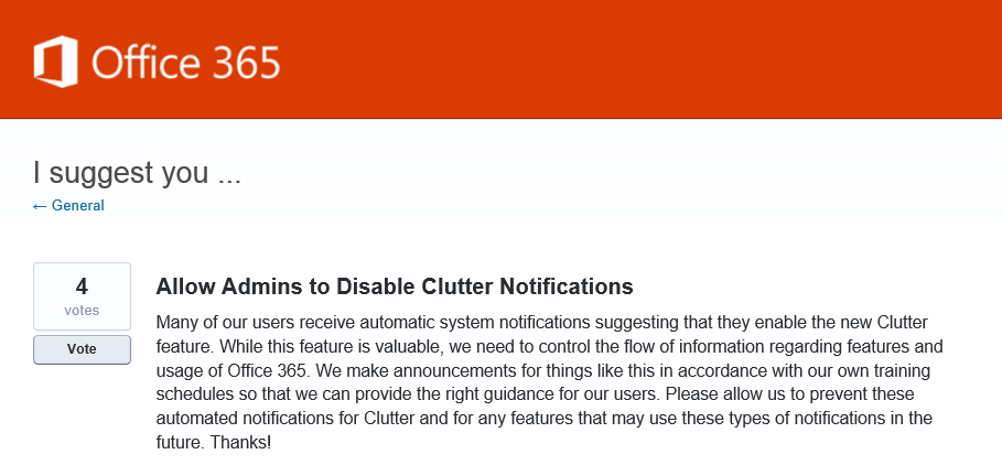 http://office365.uservoice.com/forums/264636-general/suggestions/7950201-allow-admins-to-disable-clutter-notifications