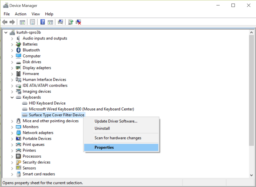 1. Go to Device manager—> Keyboards –> Surface Typecover Filter Device