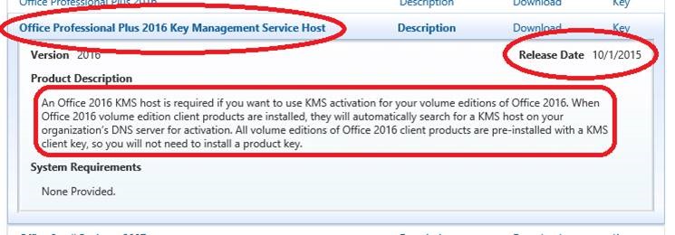 Please also note the availability of THIS SEPARATE DOWNLOAD – the Office ProPlus 2016 Key Management Service Host – that was released today as well.