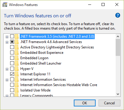 The problem is that repeatedly, it insists on attempting to install .NET Framework 3.5… and fails. Most people would think to simply look for the installation executable on Microsoft.com and install it from there, but on Windows 10, .NET Framework 3.5 is supposed to be an installable feature within Windows 10 itself. If you go to CONTROL PANEL – PROGRAMS & FEATURES & click “Turn Windows features on or off” (in the left hand column) it should display the following dialog box:
