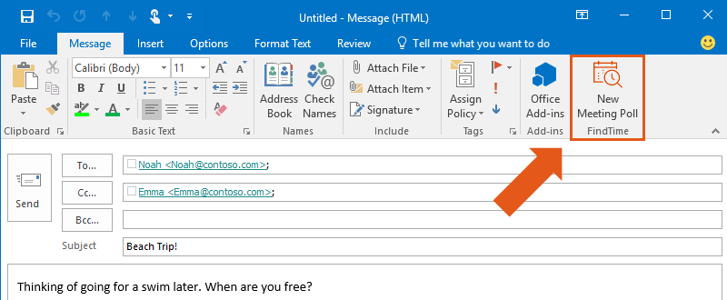 FindTime is an Outlook mail add-in that allows you to quickly find time to meet with others – something that can take weeks without FindTime! FindTime helps you pinpoint times to meet by looking at available free/busy data for your attendees as well as creating a poll where attendees can vote on the times you suggest, and even suggest new times themselves! - How do I get started?