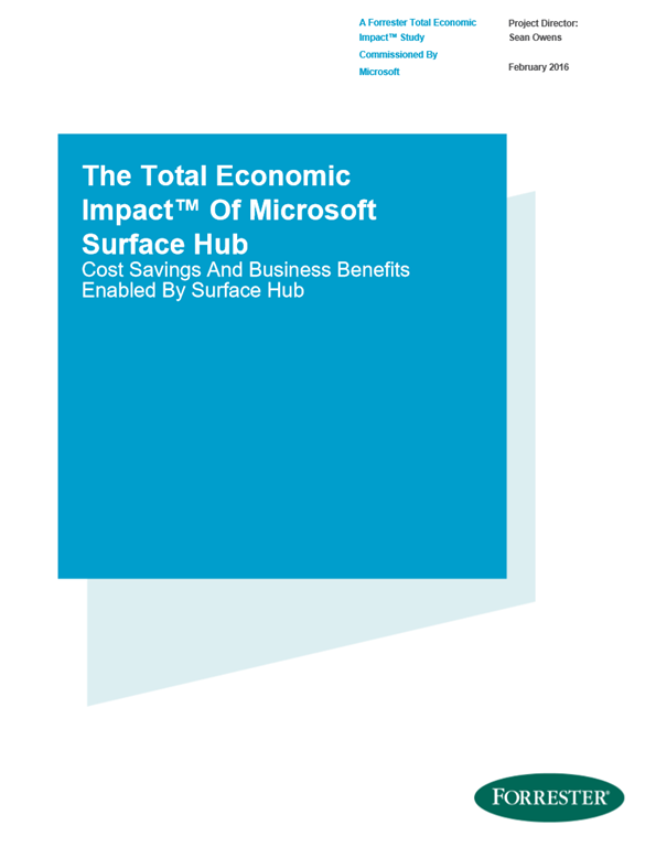 In a recent Total Economic Impact study commissioned by Microsoft, Forrester Consulting* worked with five Surface Hub early adopter customers to outline the costs, benefits and risks for implementing Surface Hub in a business environment. This resulted in benefits of more than $850,000 (3 year NPV**) based on savings in device deployment and management costs, avoided printing and device purchase costs, and improved sales. Download the study from Forrester here: