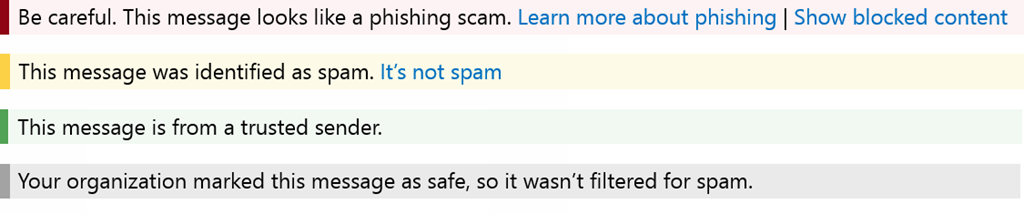 A blog post the other day (Email Safety Tips in Office 365) details a new Safety Tips feature of O365 which provides an additional layer of protection via a warning to the user in an email that is marked suspicious, or a reassurance when a message is safe.