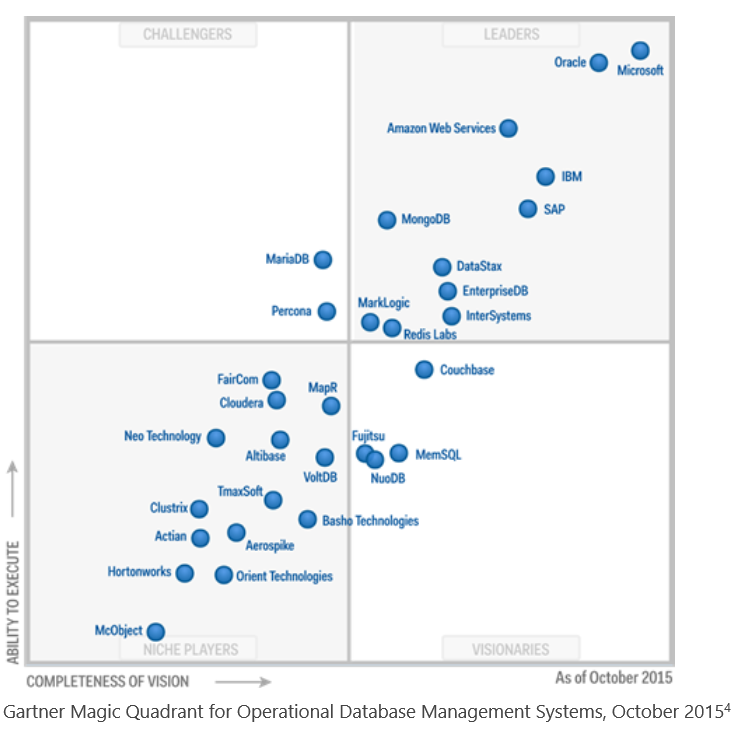 “Both industry analysts and customers recognize the breadth and depth of Microsoft’s capabilities in data, intelligence and the cloud. Microsoft is the only company recognized as a leader across data platforms and cloud by Gartner in both vision and execution in database, business intelligence, advanced analytics, data warehouse, cloud infrastructure and cloud application platforms, and the furthest in vision and ability to execute within the Leaders Quadrant in the Gartner Magic Quadrant for Operational DBMS.”