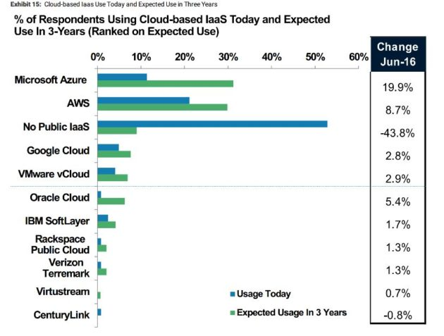 Microsoft Azure’s usage in the Infrastructure as a Service space (IaaS) will exceed that of Amazon Web Services by 2019, according to the recently released 2016 CIO Survey report by Morgan Stanley.