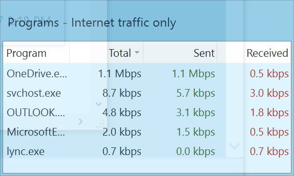 This is my favorite: It’s a view that shows you the bandwidth being consumed per-application. Sure it’s nice to know if your machine is transmitting or receiving data, but what you really want to know is if the program you’re using is DOING ANYTHING. This mode gives you a precise view of what application is consuming bandwidth… or not.