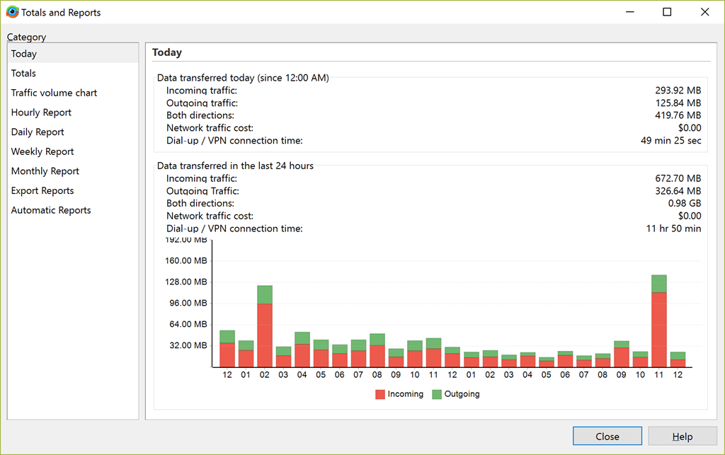 In it’s “mini-mode”, it hovers at the top of the screen and is perfect for tablets & desktops. It takes up very little room and tells you at any moment what bandwidth is being consumed either up or down. There are two tabs that allow you to specific “traffic over the network” vs “traffic over the Internet”.