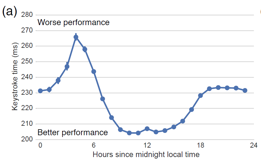 For example, the web-scale study confirms previous lab-based research that shows individual cognitive performance varies throughout the day, aligning with circadian rhythms and so-called chronotype traits – early birds achieve peak performance earlier in the day than night owls. Whenever people wake up, they are sluggish for the first hour or two of their day, a phenomenon known as sleep inertia.