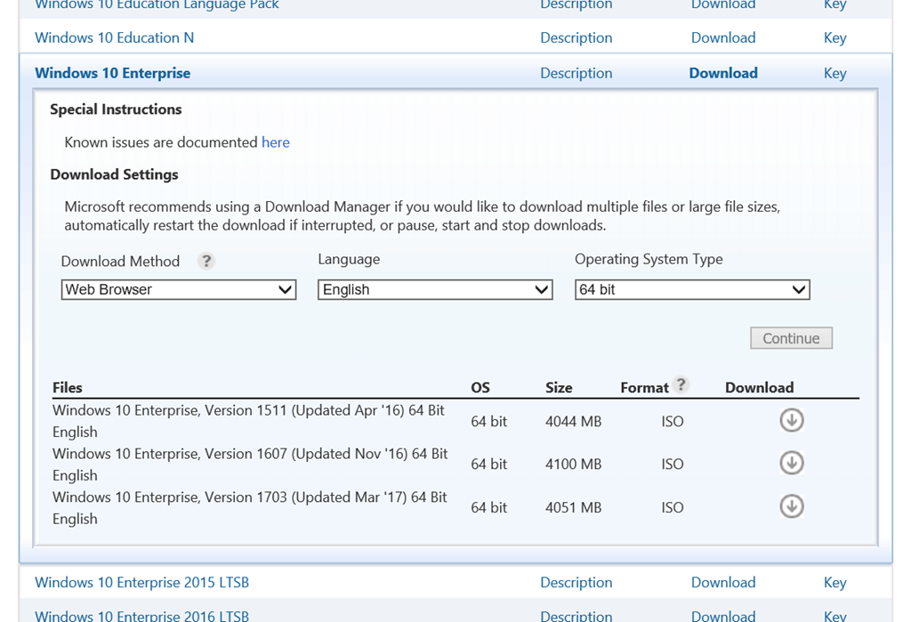 Remember that if you’re looking for the Enterprise Edition, the download is listed under “Software Assurance” and not “Windows”.