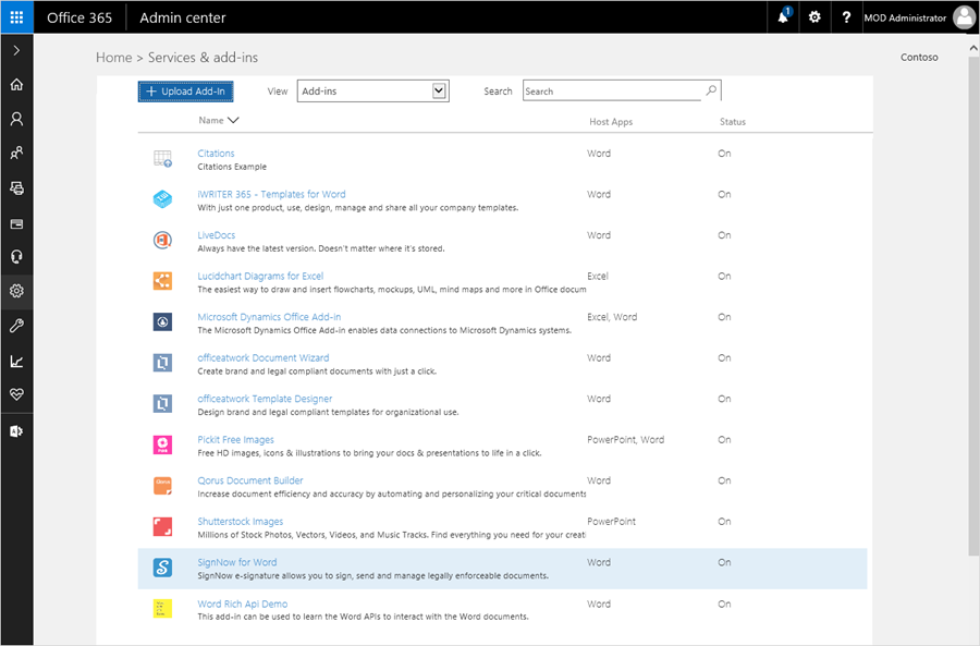 From the Office 365 admin center or by using PowerShell scripts, administrators can deploy Office web add-ins to individual users, groups or an organization with ease, using Centralized Deployment. Users can simply open Office applications—such as Word, Excel or PowerPoint on Windows, Mac or Office Online—to see the add-ins installed on their ribbon. This allows organizations—large and small—to easily extend Office with high-value services across all platforms.