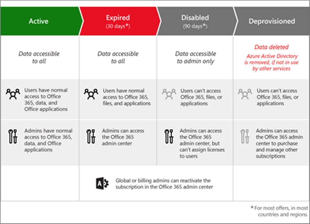 If your Office 365 subscription ends—either because it expires, or because you decide to cancel—your access to Office 365 services, applications, and customer data go through multiple states before the subscription is fully turned off, or deprovisioned. If you are aware of this progression, you’ll be better equipped to return your subscription to an active state before it’s too late, or—if you’re leaving Office 365—back up your data before it is ultimately deleted.