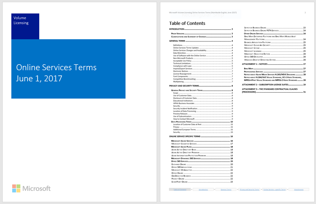 The Online Services Terms is a reference similar to the old “Product Use Rights”, except it’s for cloud services. It’s a monthly updated Word document that you can download (see below) and contains the latest terms of service. (Think of stuff like “SLAs”, “Usage rights”, “Microsoft’s obligations”, “customer obligations”, etc.)