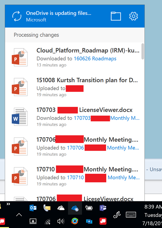 After that had been fixed, I looked down at the sync client and lo and behold, it’d apparently logged in and started syncing… And it was now syncing all ~300MB of data that had changed since the last time I’d been able to successfully sync to both OneDrive for Business as well as my SharePoint Team sites. ![]()