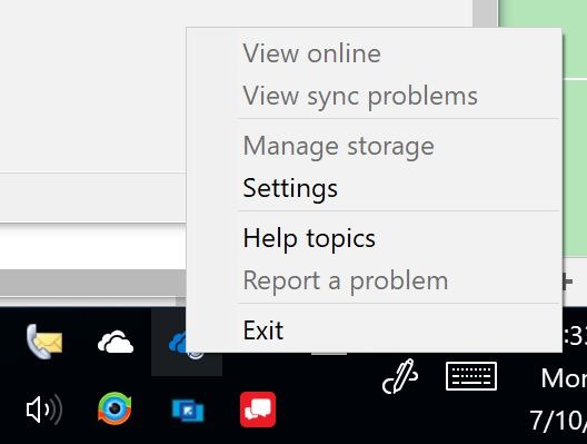 Attempting to right mouse click on the SysTray icon for OneDrive (for the OneDrive for Business connection)