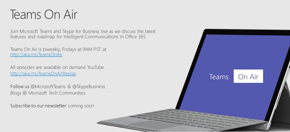 Teams On Air is a biweekly online broadcast Fridays at 9:00AM PST at: