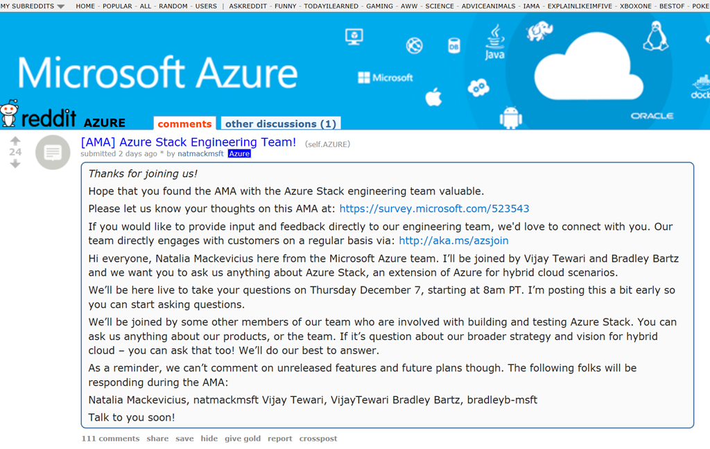 Well, I missed this AMA – sorry, but I’ve been super-heads down on work. But fortunately, you can review all the questions and answers in the archive about “Azure Stack” directly from the engineering team.