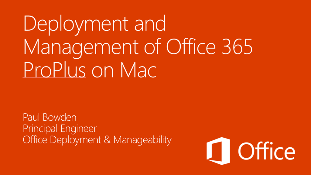 A few months ago Paul Bowden, a Software Development Engineer from Microsoft for Office Deployment & Manageability did a presentation on “Deployment & Management of Office 365 ProPlus on Mac”.