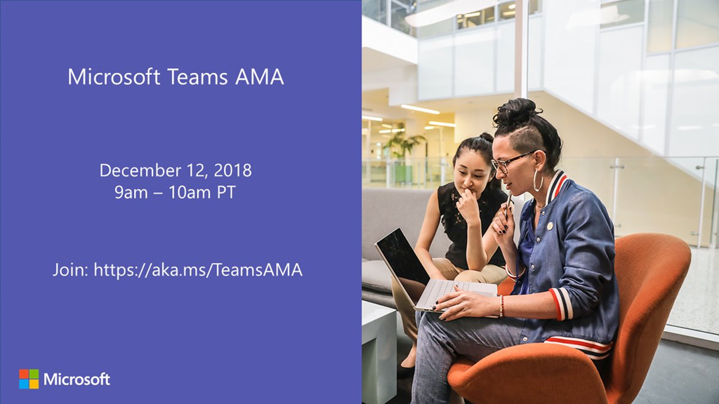 The AMA will take place on Wednesday, December 12th, 2018 from 9:00 a.m. to 10:00 a.m. PT in the Microsoft Teams AMA Space. Add the event to your calendar and view in your time zone here.
