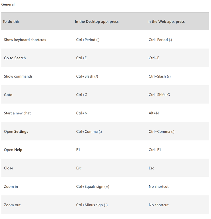 Hit “Ctrl-.” while in the Microsoft Teams client in order to get a list of keyboard shortcuts.