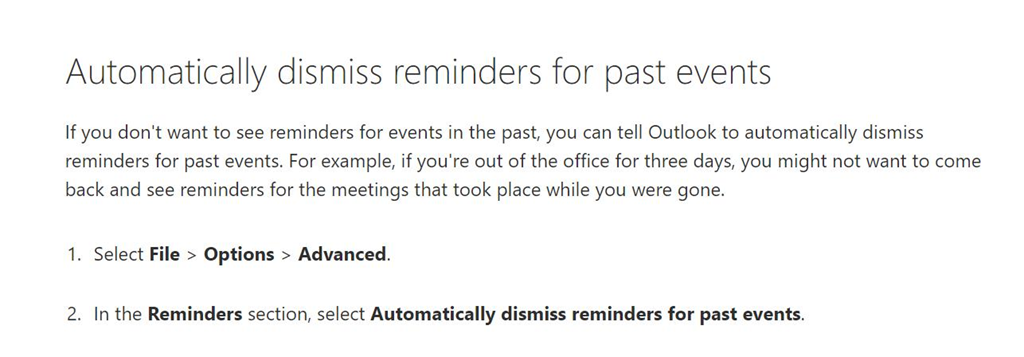 If you don’t want to see reminders for events in the past, you can tell Outlook to automatically dismiss reminders for past events. For example, if you’re out of the office for three days, you might not want to come back and see reminders for the meetings that took place while you were gone.