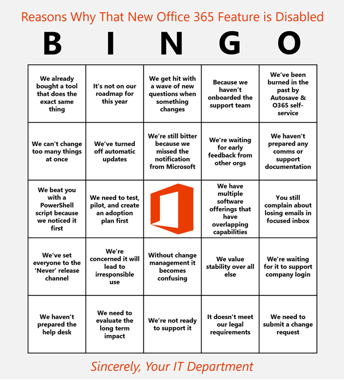 Here’s a new Office 365 bingo card for those of you wondering “why that new Office 365 feature has been disabled by your IT department”. (Courtesy of Jamie LaPorte)