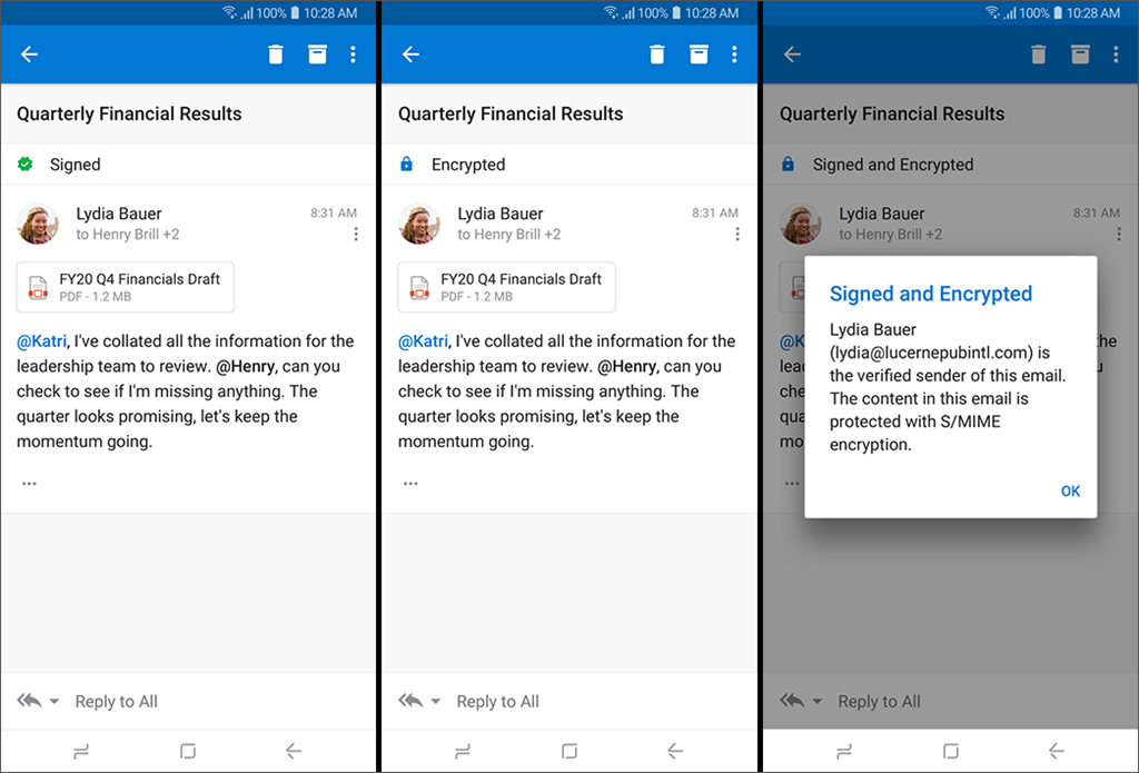 Protecting company or organizational data is extremely important. Outlook for iOS and Android supports two scenarios for classifying and/or protecting content: