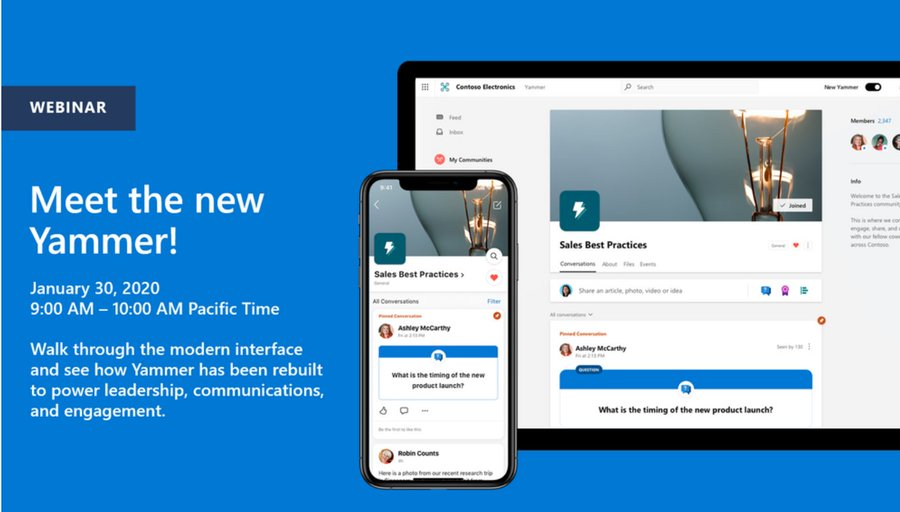 Join the Yammer product team as we introduce you to the new Yammer – a completely redesigned UI packed with new features and integrations. This webinar will walk through the modern interface, demonstrate new experiences and capabilities, and showcase how Yammer has been rebuilt to power leadership, communications, and engagement. Attendees will have the opportunity for Q&A with the Yammer engineering + marketing team to help prepare for the arrival of the new Yammer. Watch and Add it to your calendar.