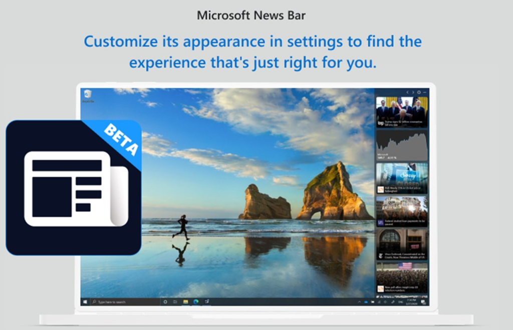 The News Bar brings you the latest news from the Microsoft News network of over 4500 of the world’s most respected journalism brands. In addition, you can configure it to provide you with up to date information throughout the day on your favorite stocks.