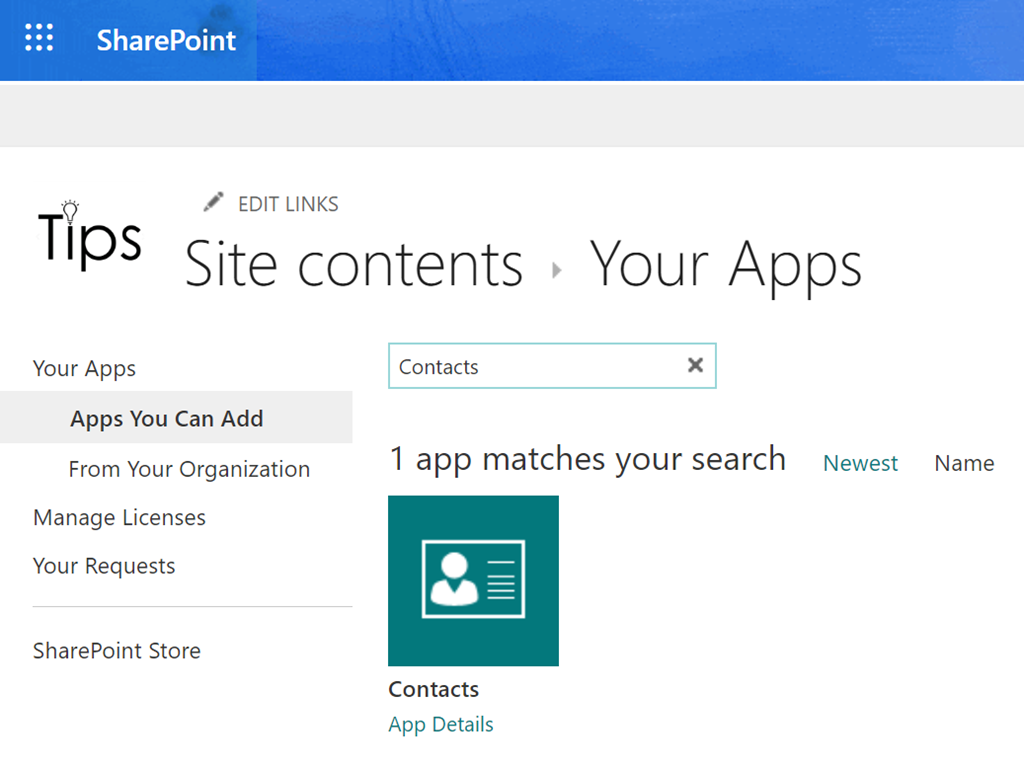 Once completed, you will see a list of Site Contents for your SharePoint Online site. This should include an item of type “Contacts”- Click on the Contacts database you just created in the list. You’ll be taken to a web view of the contacts in the database.
