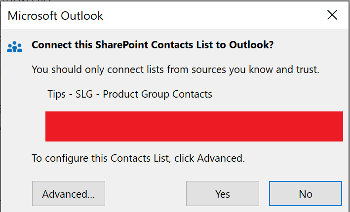 This will immediately open a dialog box in Outlook requesting permission to establish a SharePint Contacts list sync.