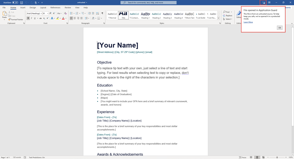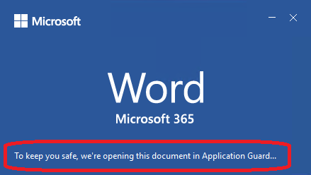 Files from the internet and other potentially unsafe locations can contain viruses, worms, or other kinds of malware that can harm your users’ computer and data. To help protect your users, Office opens files from potentially unsafe locations in Application Guard, a secure container that is isolated from the device through hardware-based virtualization. When Office opens files in Application Guard, users can securely read, edit, print, and save those files without