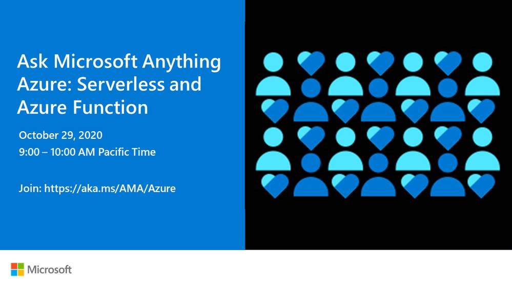 Microsoft is very excited to announce an “Azure Serverless & Azure Function” Ask Microsoft Anything (AMA) on October 29! The AMA will take place on Thursday, October 29, 2020 from 9:00 a.m. to 10:00 a.m. PT in the Azure AMA space. Add the event to your calendar and view in your time zone here.