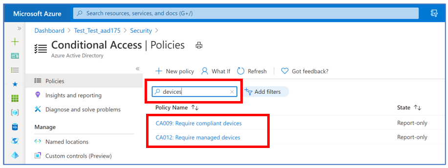 The Conditional Access policy list page has been enhanced with the search bar so that you can quickly and easily find a particular policy by name. The search automatically performs a starts-with and substring search on the list of policy names. The substring search is performed on whole words, partial words, and includes support for special characters. The search is case-insensitive.