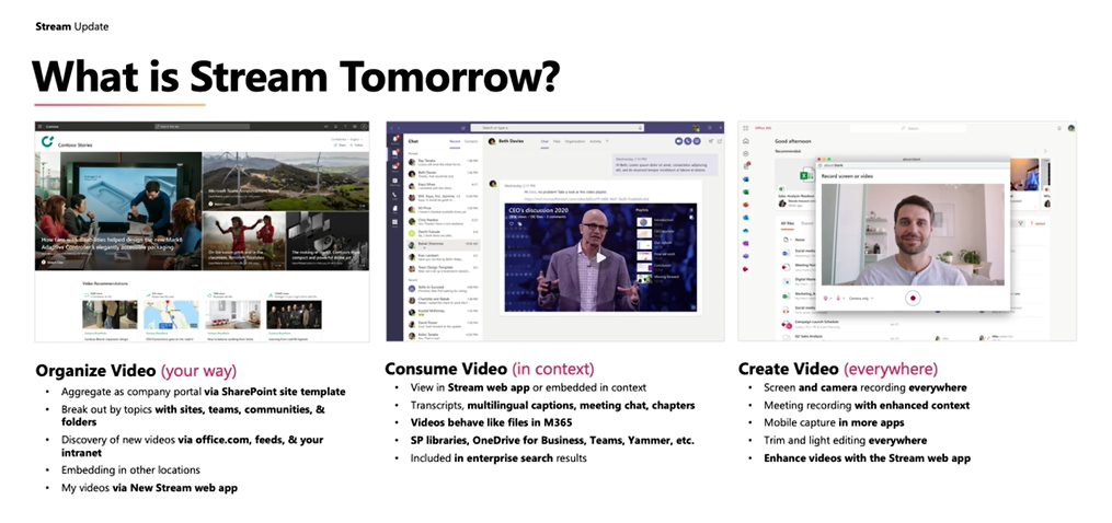 With video that will be stored in Microsoft 365, the new version of Stream builds on the rich content management features of SharePoint and unlocks the intelligence of Microsoft Graph to enhance videos across Microsoft 365.