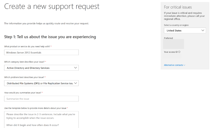 One of the great benefits of having a Premier or Unified Support agreement is having access to the Services Hub. The Services Hub provides, among other things, the ability to open Support Tickets for break/fix issues:
