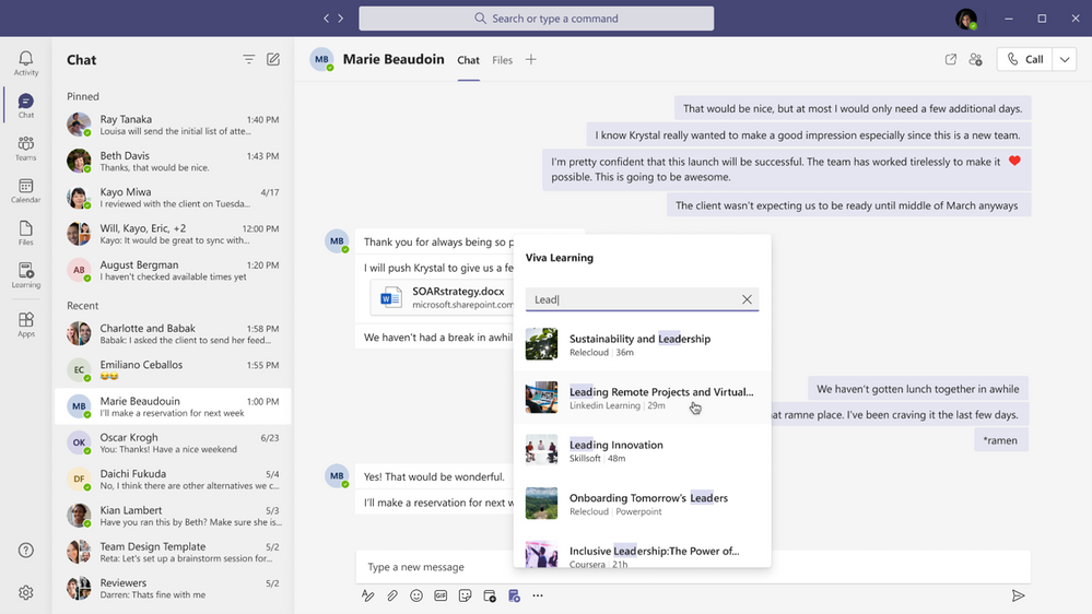 At Microsoft Ignite in March, we shared a new set of product features and admin capabilities, derived from our private preview customer feedback and internal use scenarios. With this feedback we’re continuing to build Viva Learning to seamlessly integrate learning into the tools you already use everyday – you can share learning via chat, pin learning content in existing Teams channels, recommend learning, see all your available learning sources in a personalized view, search across available sources, and so much more.