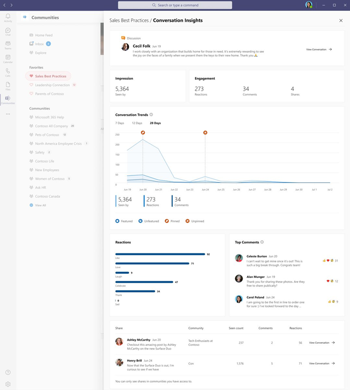 Want to understand how communications and conversations diffuse across and impact your organization? Use “Conversation Insights” on both Yammer and in the Communities app in Microsoft Teams now generally available!