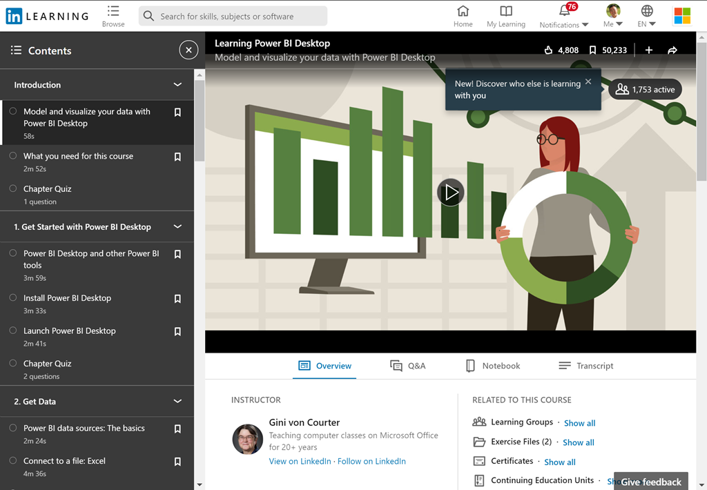 Power BI Desktop—the powerful data analysis and visualization software from Microsoft—can help you get more insights from your data, whether that data is stored on your computer or in the cloud. In this course, discover how to leverage this easy-to-use tool to more efficiently model and visualize data. Learn how to connect various data sources, including Excel, databases, and web data sources like Wikipedia. Explore how to search and transform your data using the built-in Query Editor. Plus, instructor Gini von Courter shows how to build and arrange visualizations, create interactive reports, share your work, manage your published files in the Power BI service, and more.