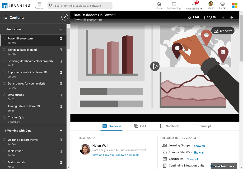 Power BI is a powerful data analytics and visualization tool that allows business users to monitor data, analyze trends, and make decisions. In this course, Helen Wall focuses on the front end of the Power BI application—the dashboard—where users interact with charts and graphs that communicate trends in their data. Throughout this course, Helen steps through how to design and customize the setup of visuals and charts to make it easy to use, understand, and interact with the dashboard model. Learn how to work with data from open-source websites, create visuals such as heatmaps and sparklines, compare multiple variables with trendlines and violin plots, and build engaging maps. To wrap up, she demonstrates how to create and share your finished product: an intuitive, engaging dashboard.