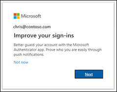 You can nudge users to set up Microsoft Authenticator during sign-in. Users will go through their regular sign-in, perform multifactor authentication as usual, and then be prompted to set up Microsoft Authenticator. You can include or exclude users or groups to control who gets nudged to set up the app. This allows targeted campaigns to move users from less secure authentication methods to Microsoft Authenticator.
