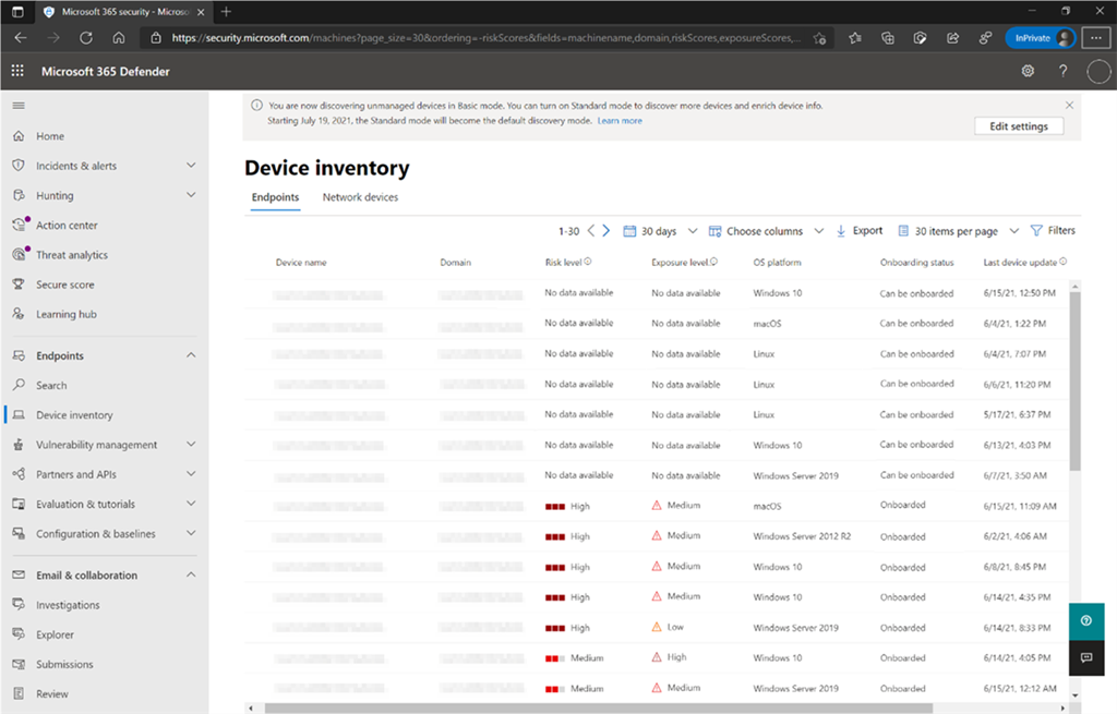 As of today, if you are a Microsoft Defender for Endpoint subscriber, you will notice endpoint discovery has already been enabled on your tenant. This is indicated by a banner that appears in the Endpoint/Device inventory section of the Microsoft 365 Defender console.
