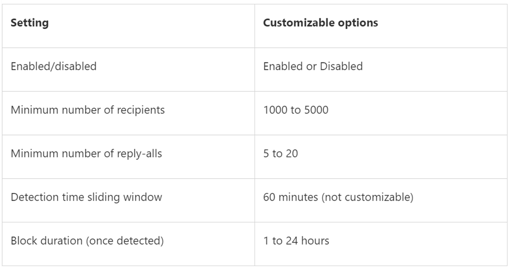 Today we’re pleased to announce you’ll now have the ability to make these settings specific to your Microsoft 365 organization; email admins will have the flexibility to enable/disable the feature, and set customized detection thresholds and block duration time. This not only makes it more flexible to tailor for your organization, but it also allows more Microsoft 365 customers to take advantage of the Reply-all Storm Protection feature since the minimum number of reply-all recipients for detection can now be as low as 1000 when previously it was hard-coded at 5000.
