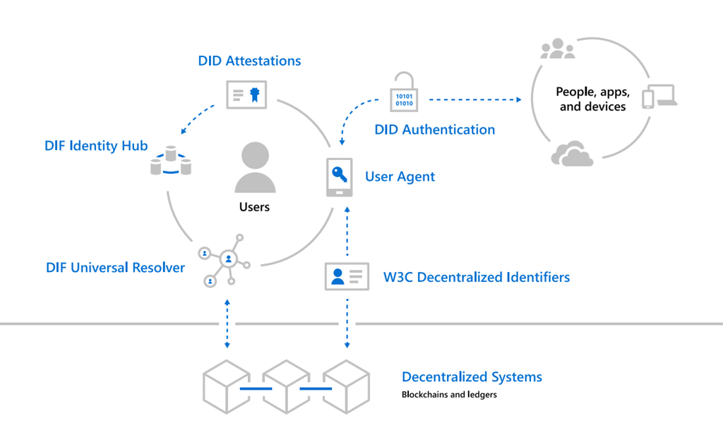 Leveraging Open Standards, Microsoft’s approach to decentralized identity includes blockchain-connected decentralized system groups that include:
