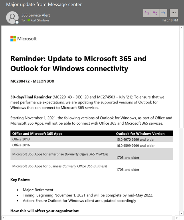 This is really important if you don’t visit the M365 Admin Console’s Message Center regularly. Changes to services are often released to end users and the only way administrators are notified preemptively is through the message center.
